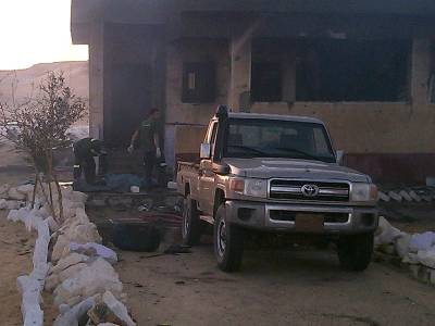 REFILE - REMOVING RESTRICTION Damage is seen at a checkpoint on the Egyptian border with Sudan and Libya, which was attacked on Saturday, in Wadi al-Gadid governorate July 19, 2014. Gunmen killed 21 Egyptian military border guards near the frontier with Libya on Saturday, highlighting a growing threat from an area that security officials say has become a haven for militants seeking to topple the Cairo government. Picture taken July 19. REUTERS/Al Youm Al Saabi Newspaper (EGYPT - Tags: CIVIL UNREST POLITICS)