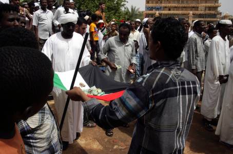 People donate money on a Palestinian flag, during protest against Israel's military operation in Gaza Strip, after Jumma prayer in Khartoum July 18, 2014. REUTERS/Stringer (SUDAN - Tags: CIVIL UNREST POLITICS RELIGION SOCIETY)