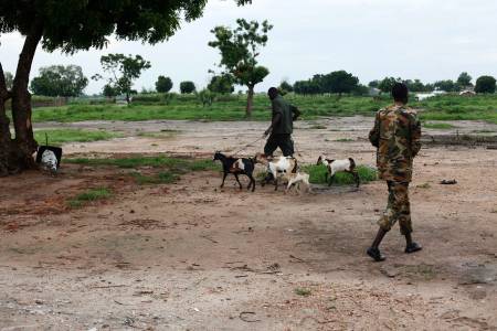 REFILE - ADDING BYLINE A soldier from Sudan People�s Liberation Army-In Opposition (SPLA-IO) walks goats in Leer, Unity State, July 17, 2014. REUTERS/Andreea Campeanu (SOUTH SUDAN - Tags: CIVIL UNREST ANIMALS MILITARY)