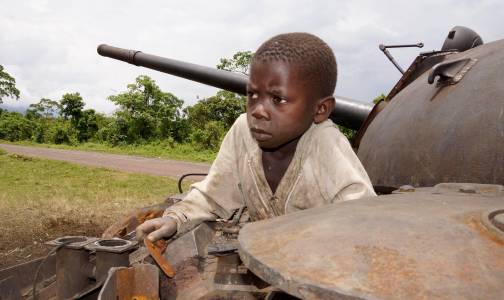 A Congolese boy plays on a destroyed military tank, abandoned by the M23 rebel fighters who surrendered in Kibumba, near the eastern town of Goma November 6, 2013. Democratic Republic of Congo's M23 rebel group on Tuesday called an end to a 20-month revolt after the army captured its last hilltop strongholds, raising hopes for peace in a region where millions have died in nearly two decades of violence. REUTERS/Kenny Katombe (DEMOCRATIC REPUBLIC OF CONGO - Tags: MILITARY CIVIL UNREST CRIME LAW)
