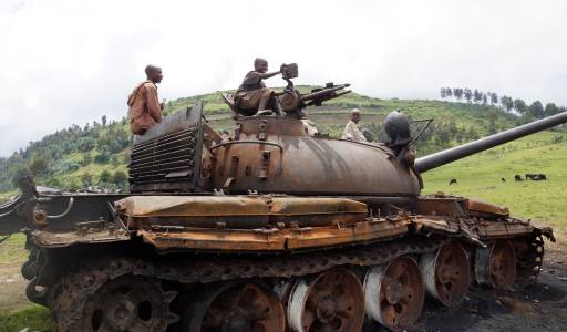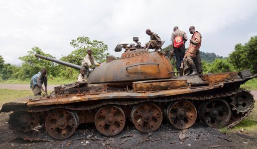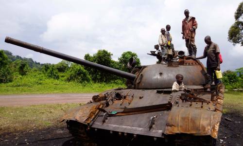 Congolese children play on a destroyed military tank, abandoned by the M23 rebel fighters who surrendered in Kibumba, near the eastern town of Goma November 6, 2013. Democratic Republic of Congo's M23 rebel group on Tuesday called an end to a 20-month revolt after the army captured its last hilltop strongholds, raising hopes for peace in a region where millions have died in nearly two decades of violence. REUTERS/Kenny Katombe (DEMOCRATIC REPUBLIC OF CONGO - Tags: MILITARY CIVIL UNREST CRIME LAW)