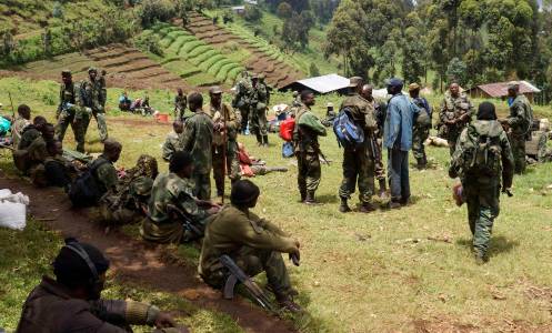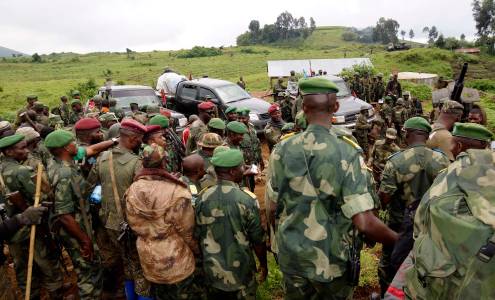 Congolese soldiers gather for a military briefing after M23 rebel fighters surrendered in Chanzo village