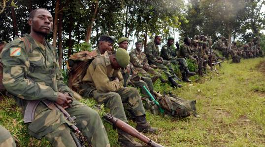 Congolese soldiers rest while being deployed against the M23 rebels near Bunagana, north of Goma