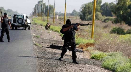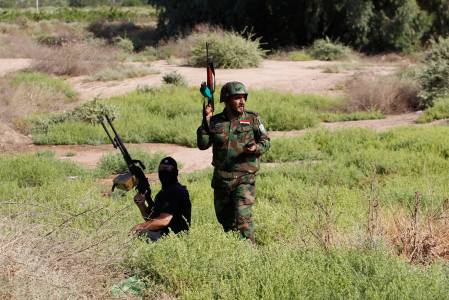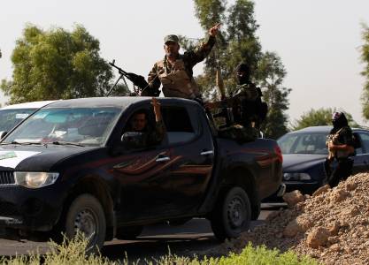 Armed Shi'ite volunteers from brigades loyal to radical cleric al-Sadr, take their positions during a military advance in areas on the outskirts of Samarra