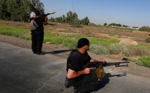 Armed Shi'ite volunteers from brigades loyal to radical cleric Muqtada al-Sadr, take their positions during a military advance in areas under the control of militants of the Islamic State, formerly known as the Islamic State in Iraq and the Levant (ISIL), on the outskirts of Samarra July 12, 2014. Followers of al-Sadr, who fought U.S. troops under the banner of the Mehdi Army during the 2003-2011 occupation, have returned as Sadr's new "Peace Brigades." The black-turbaned cleric was shown on television this week surrounded by aides in camouflage poring over maps of deployments around Samarra. Picture taken July 12, 2014. REUTERS/Thaier Al-Sudani (IRAQ - Tags: CIVIL UNREST POLITICS)