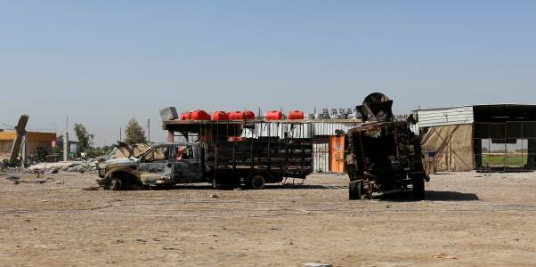 Burnt vehicles belonging to the Iraqi security forces are seen on a road leading to Samarra at Salahuddin province