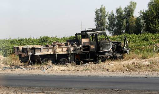 A burnt vehicle belonging to the Iraqi security forces is seen on a road leading to Samarra at Salahuddin province
