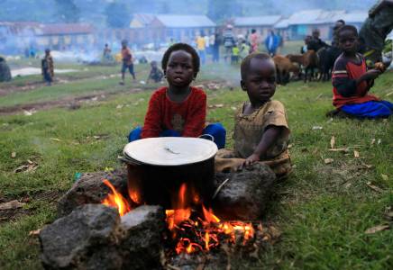 Children sit around a pot in a field with other displaced families in the Ugandan town of Bunagana