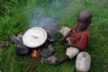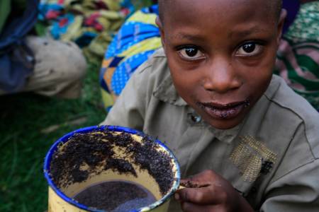 A boy drinks porridge for dinner in a field in the Ugandan town of Bunagana