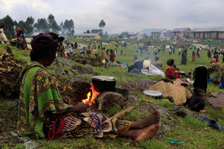 A woman, displaced by fighting between the Congolese army and M23 rebels in Bunagana in the eastern Democratic Republic of Congo, prepares dinner in a field with other displaced families in the Ugandan town of Bunagana, 491 km (305 miles) west of the capital Kampala October 31, 2013. Congo's army said on Thursday it was hunting rebels deep in the forests and mountains along the border with Rwanda and Uganda, the insurgents' last hideouts after they were driven from towns they seized during a 20-month rebellion. REUTERS/James Akena (UGANDA - Tags: POLITICS CIVIL UNREST)