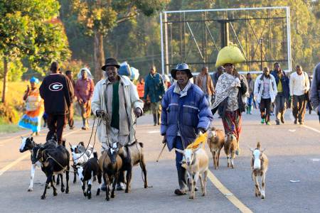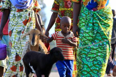 Congolese people displaced by fighting between the Congolese army and M23 rebels in Bunagana in the eastern Democratic Republic of Congo, make their way home after spending a night in the Ugandan town of Bunagana, 491 km (305 miles) west of capital Kampala October 31, 2013. Civilians celebrated in the streets on Wednesday as Congolese troops entered the eastern border town of Bunagana after a major new success in their offensive to crush a 20-month rebellion. The town was the first seized last year by M23 rebels in the Democratic Republic of Congo and the last they held after being forced back recently by Congo's U.N.-backed army. Bunagana was strategic during the rebellion, allowing the M23 to control lucrative cross-border taxation and giving them access to Uganda and Rwanda, which are accused by U.N. experts of backing the rebels, something both nations deny. REUTERS/James Akena (UGANDA - Tags: POLITICS CIVIL UNREST ANIMALS)