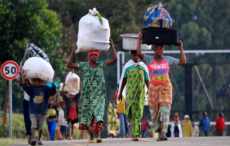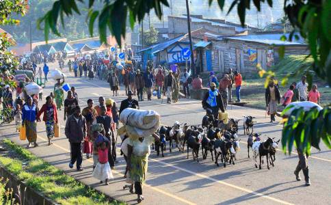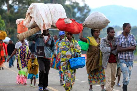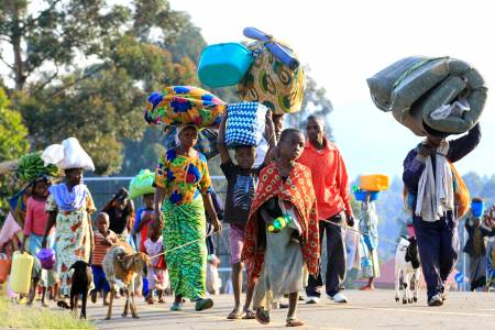 People displaced by fighting between the Congolese army and M23 rebels in Bunagana in the eastern Democratic Republic of Congo make their way home after spending a night in the Ugandan town of Bunagana