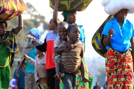 A boy, displaced by fighting between the Congolese army and M23 rebels in Bunagana in the eastern Democratic Republic of Congo, carries a crying child on his back as they make their way home after spending a night in the Ugandan town of Bunagana, 491 km (305 miles) west of capital Kampala October 31, 2013. Civilians celebrated in the streets on Wednesday as Congolese troops entered the eastern border town of Bunagana after a major new success in their offensive to crush a 20-month rebellion. The town was the first seized last year by M23 rebels in the Democratic Republic of Congo and the last they held after being forced back recently by Congo's U.N.-backed army. Bunagana was strategic during the rebellion, allowing the M23 to control lucrative cross-border taxation and giving them access to Uganda and Rwanda, which are accused by U.N. experts of backing the rebels, something both nations deny. REUTERS/James Akena (UGANDA - Tags: POLITICS CIVIL UNREST)