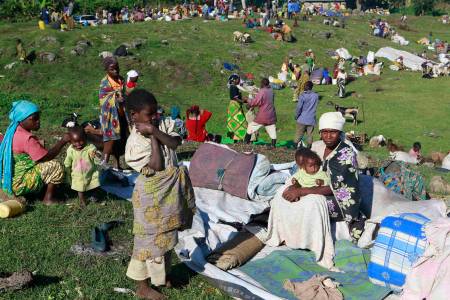 Families displaced by fighting between the Congolese army and M23 rebels in Bunagana in the eastern Democratic Republic of Congo, sit in a field after spending a night in the Ugandan town of Bunagana, 491 km (305 miles) west of capital Kampala October 31, 2013. Civilians celebrated in the streets on Wednesday as Congolese troops entered the eastern border town of Bunagana after a major new success in their offensive to crush a 20-month rebellion. The town was the first seized last year by M23 rebels in the Democratic Republic of Congo and the last they held after being forced back recently by Congo's U.N.-backed army. Bunagana was strategic during the rebellion, allowing the M23 to control lucrative cross-border taxation and giving them access to Uganda and Rwanda, which are accused by U.N. experts of backing the rebels, something both nations deny. REUTERS/James Akena (UGANDA - Tags: POLITICS CIVIL UNREST)