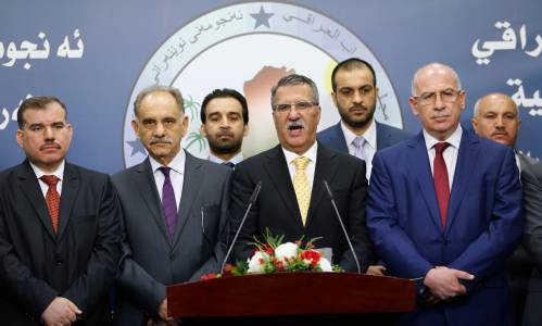 Osama al-Nujaifi, speaker of the Iraqi Council of Representatives, attends a news conference by members of Sunni political bloc Mutahidoon after the first session of the Iraqi Parliament in Baghdad