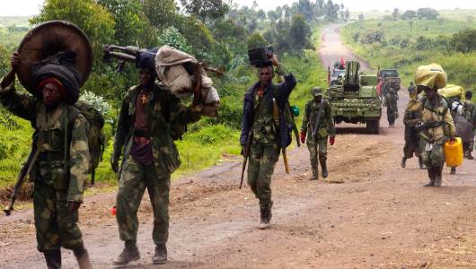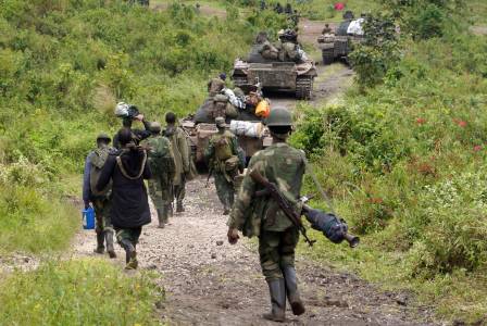 Congolese soldiers move to frontline positions as they advance against the M23 rebels in Kibumba
