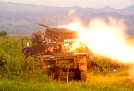 Rockets are fired from a Congolese army vehicle in the direction of M23 rebels in Kibumba