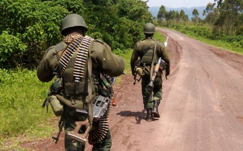 Congolese armed forces soldiers take position while battling M23 rebels in Kibumba