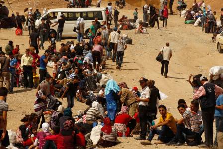 Syrian refugees, fleeing the violence in their country, wait to cross the border into the autonomous Kurdish region of northern Iraq