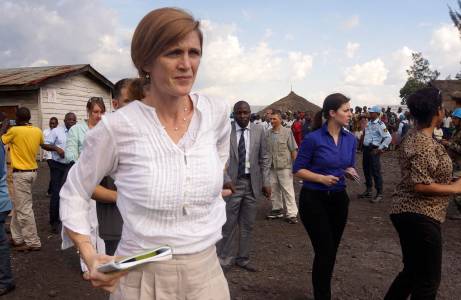 U.S. Ambassador to the United Nations (U.N.) Samantha Power visits the Mugunga III camp for internally displaced people in Goma, eastern Democratic Republic of Congo, October 6, 2013. Congo's army and the 17,000-strong MONUSCO have struggled against M23, which briefly occupied the eastern city of Goma in November, forcing Congolese President Joseph Kabila to accept the Ugandan-brokered peace talks as a condition of the rebels' withdrawal. REUTERS/Kenny Katombe (DEMOCRATIC REPUBLIC OF CONGO - Tags: POLITICS CIVIL UNREST)