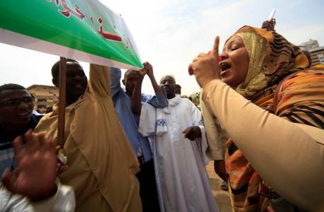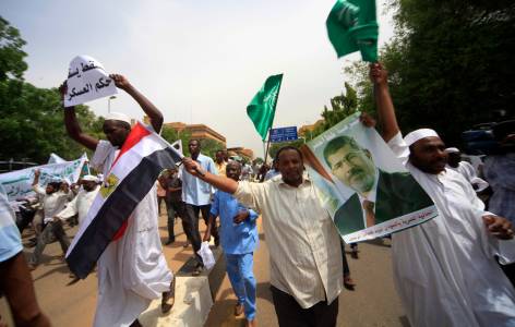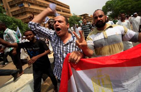 Sudanese and Egyptian Islamist supporters of deposed Egyptian President Mohamed Mursi shout slogans during a rally after taking part in Jumma prayers to protest against the recent violence in Egypt, in Khartoum