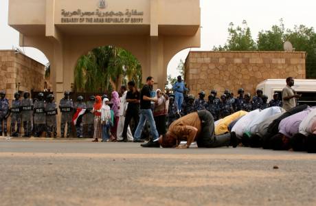 Supporters of deposed Egyptian President Mursi pray in front of the Egyptian embassy in Khartoum, during a rally protesting against Egyptian security forces for opening fire during clashes in Egypt