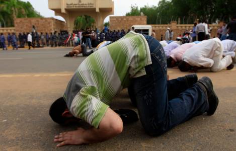Sudanese and Egyptian Islamist supporters of deposed Egyptian President Mohamed Mursi pray in front of the Egyptian embassy in Khartoum, during a rally protesting against Egyptian security forces for opening fire during clashes in Egypt, August 14, 2013. At least 95 Egyptians were killed on Wednesday in Cairo after security forces moved in on protesters demanding the reinstatement of Mursi, and the government imposed a state of emergency as unrest swept Egypt. REUTERS/ Mohamed Nureldin Abdallah (SUDAN - Tags: CIVIL UNREST POLITICS)
