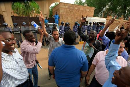Supporters of deposed Egyptian President Mursi shout slogans in front of the Egyptian embassy in Khartoum, during a rally protesting against Egyptian security forces for opening fire during clashes in Egypt