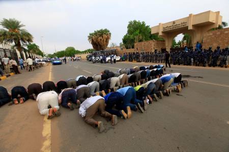 Supporters of deposed Egyptian President Mursi pray in front of the Egyptian embassy in Khartoum, during a rally protesting against Egyptian security forces for opening fire during clashes in Egypt
