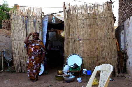 An Eritrean refugee poses for a picture inside her home in Khartoum