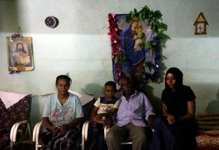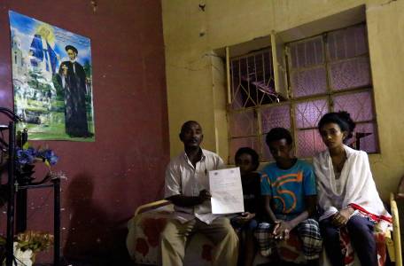 An Eritrean refugee holds a document of his family's refugee status as they pose for a picture inside their home in Khartoum