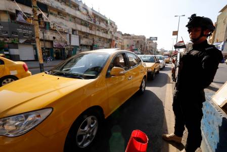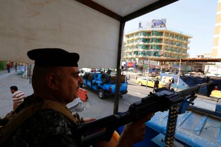 A member of the Iraqi security forces guards a checkpoint during an intensive security deployment in Baghdad