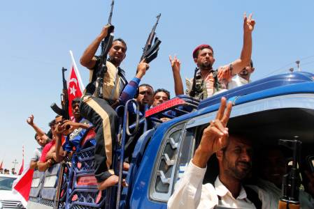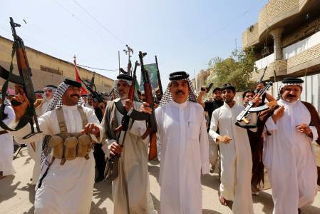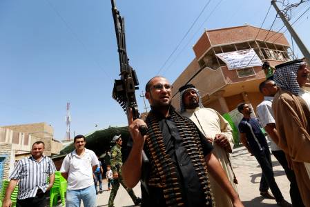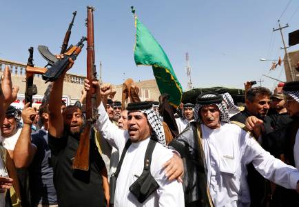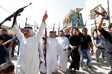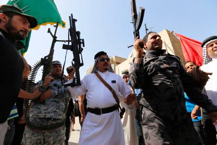 Volunteers from the Shi'ite Badr Organization, who have joined the Iraqi army to fight against the predominantly Sunni militants from the radical Islamic State of Iraq and the Levant (ISIL) who have taken over Mosul and other northern provinces, chant slogans in Basra June 14, 2014. Iraqi Prime Minister Nuri al-Maliki told army officers in the city of Samarra that volunteers were arriving to help defeat Islamist militants who have swept through Sunni Muslim territory towards Baghdad. REUTERS/ Essam Al-Sudani (IRAQ - Tags: CIVIL UNREST POLITICS MILITARY)