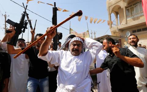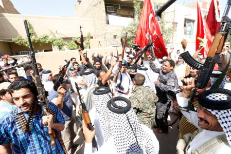 Iraqi Shiite men shout slogans in support for the call to arms in Baghdad's Sadr city, June 14, 2014. Iraqi Shiite men shout slogans in support for the call to arms in Baghdad's Sadr city. REUTERS/Thaier Al-Sudani (IRAQ - Tags: CIVIL UNREST POLITICS MILITARY CONFLICT)