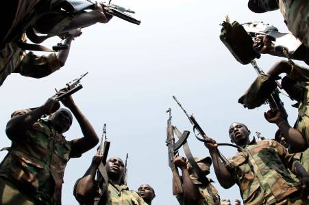 Congolese M23 rebels hold their weapons as they celebrate repelling an attack by another rebel group, the Mai Mai, in Kiwanja town