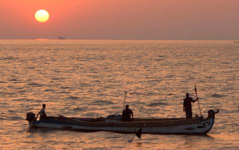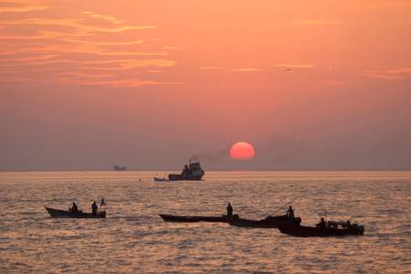 Iraqi fishermen travel in their boats in Iraqi territorial waters as the sun sets in Basra province