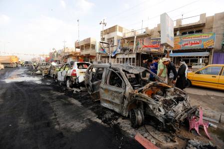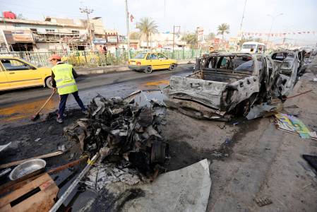 A man looks at the site of a bomb attack in Baghdad's Habibiya district, April 17, 2014. At least eight people were killed in the car bomb attack in a predominantly Shi'ite neighbourhood on the eastern edge of the capital Baghdad on Wednesday, hospital and police officials said. More than 26 others were wounded in the attack that took place in a busy commercial area in Habibiya district of the Shi'ite working-class district of Sadr City, just few metres away from the district's police centre. REUTERS/Thaier al-Sudani (IRAQ - Tags: CIVIL UNREST)