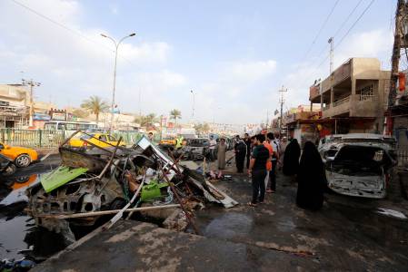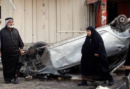 People gather at the site of a bomb attack in Baghdad's Habibiya district