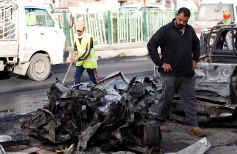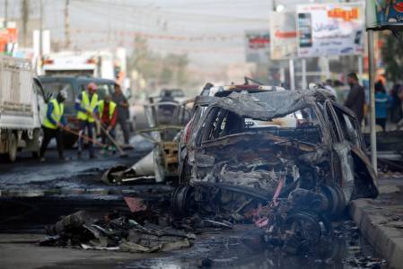 Municipality workers clean the site of a bomb attack in Baghdad's Habibiya district, April 17, 2014. At least eight people were killed in the car bomb attack in a predominantly Shi'ite neighbourhood on the eastern edge of the capital Baghdad on Wednesday, hospital and police officials said. More than 26 others were wounded in the attack that took place in a busy commercial area in Habibiya district of the Shi'ite working-class district of Sadr City, just few metres away from the district's police centre. REUTERS/Thaier al-Sudani (IRAQ - Tags: CIVIL UNREST)