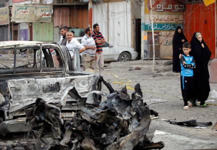 Residents look at the scene of a car bomb explosion in Baghdad's Habibiya district, April 17, 2014. At least eight people were killed in the car bomb attack in a predominantly Shi'ite neighbourhood on the eastern edge of the capital Baghdad on Wednesday, hospital and police officials said. More than 26 others were wounded in the attack that took place in a busy commercial area in Habibiya district of the Shi'ite working-class district of Sadr City, just few metres away from the district's police centre. REUTERS/Thaier al-Sudani (IRAQ - Tags: CIVIL UNREST)