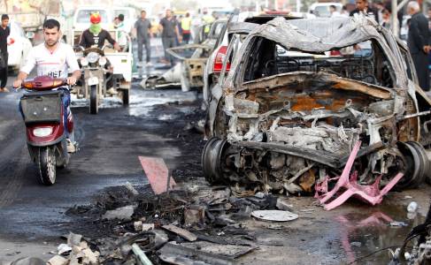 Man rides a motorcycle past the site of a bomb attack in Baghdad's Habibiya district