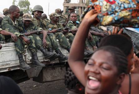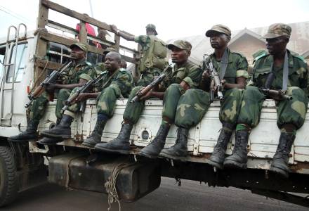 Government army FARDC soldiers drive in trucks as they arrive in Goma