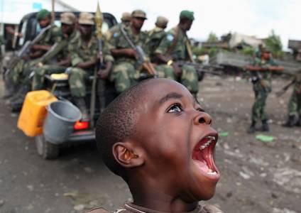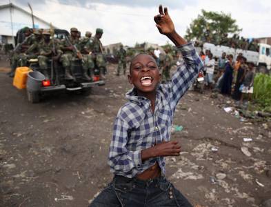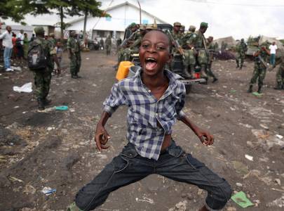 A boy dances to celebrate government army FARDC soldiers return to Goma