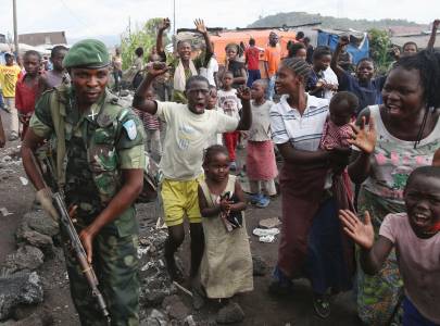 A boy dances to celebrate government army FARDC soldiers' return to Goma