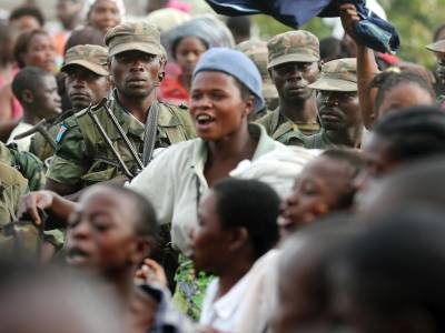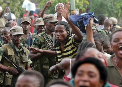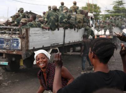 People dance and sing around government army FARDC soldiers as they celebrate their return to Goma