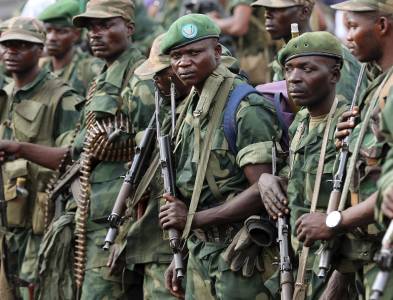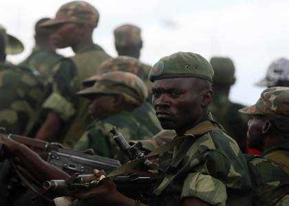 Government army FARDC soldiers stand in a line in an army barrack as they return to Goma