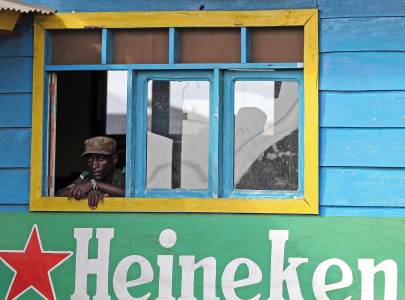A government army FARDC soldier looks out of a window in an army base as they return to Goma