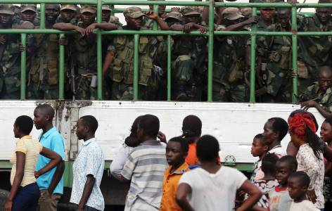 Government army FARDC soldiers drive in trucks as they arrive at Goma