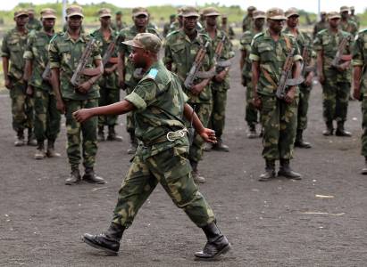 A government army FARDC soldier stands in a formation during a briefing by their commander in the town of Sake, some 27 km (17 miles) west of Goma