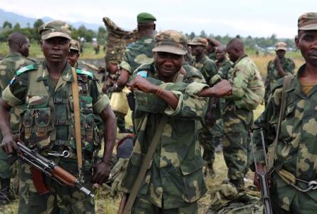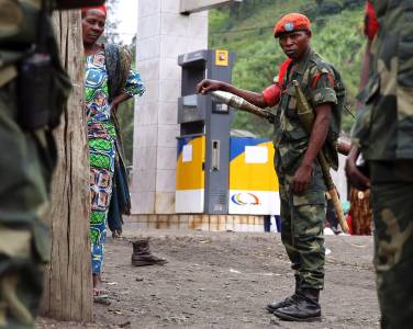 Government army FARDC soldiers stand in the town of Sake, some 27 km (17 miles) west of Goma